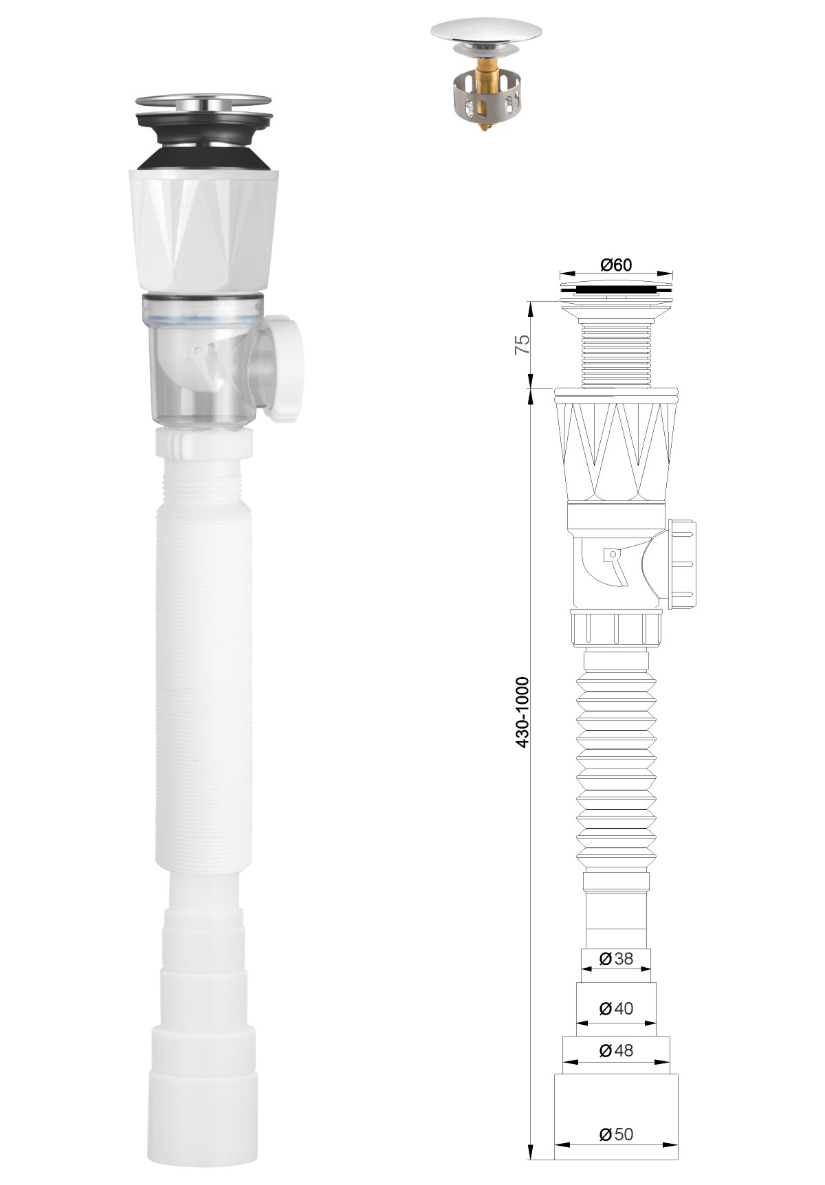 Stainless steel water for wash basin 1 1/4" clic-clac