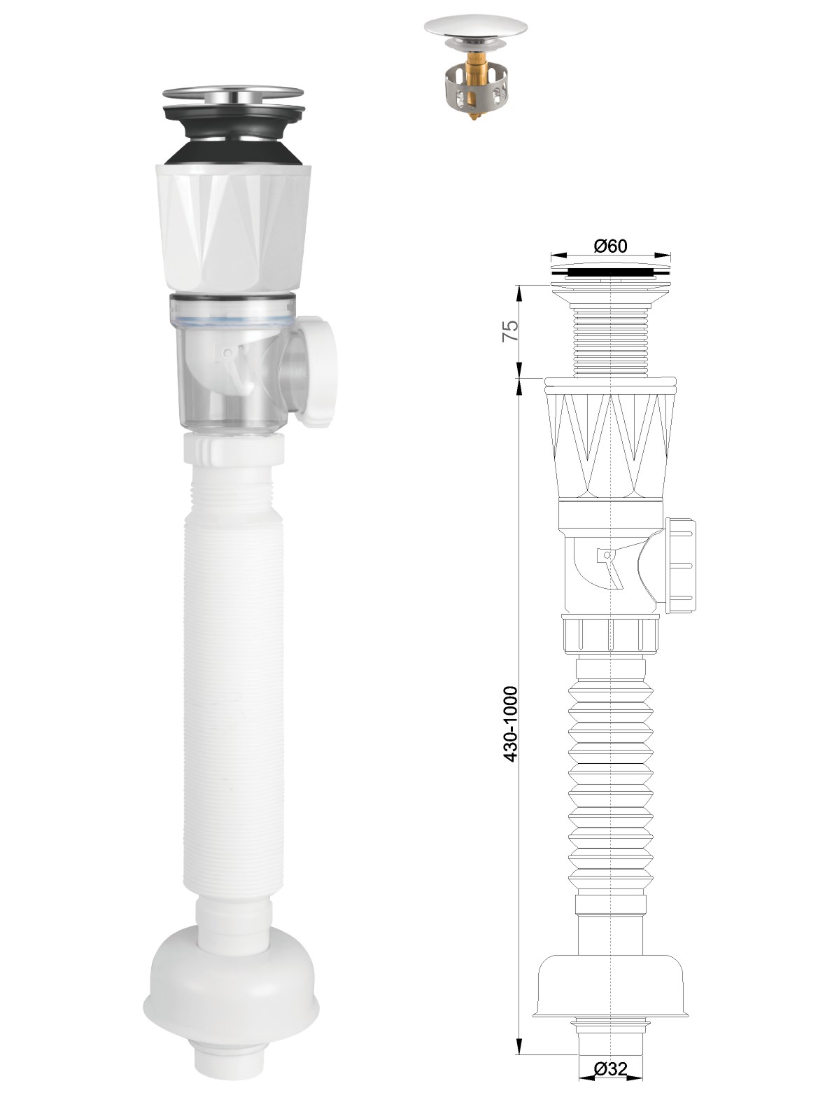 Stainless steel water for wash basin 1 1/4" clic-clac