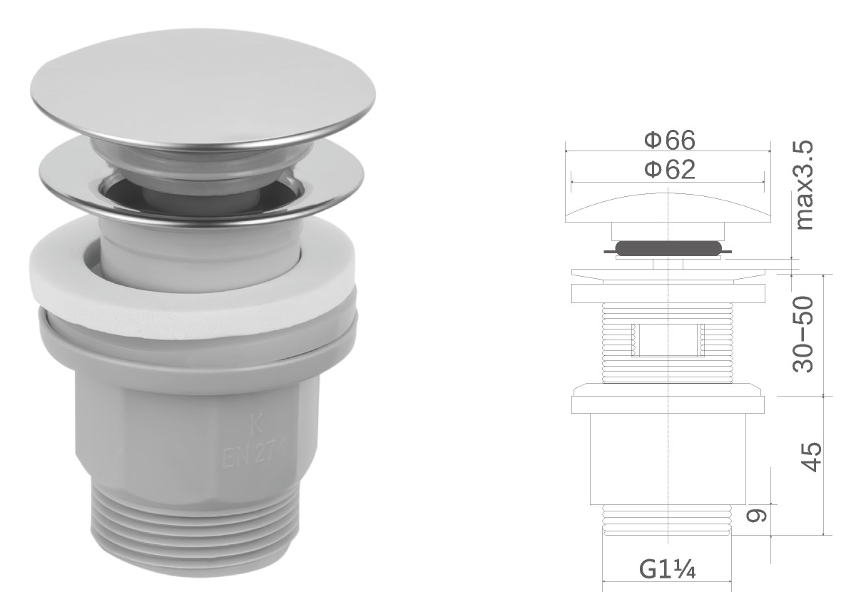 Stainless steel water for wash basin 1 1/4" clic-clac